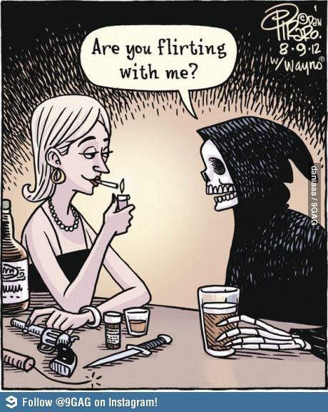 In this cartoon, it shows a woman smoking, death, and multiple factors that can lead to death. It then shows the symbol of death that says “are you flirting with me?” which suggests that by smoking the woman wants death. After analyzing this cartoon, the use of rhetoric is pathos which is appealing to the audience’s emotion of the effects of smoking.